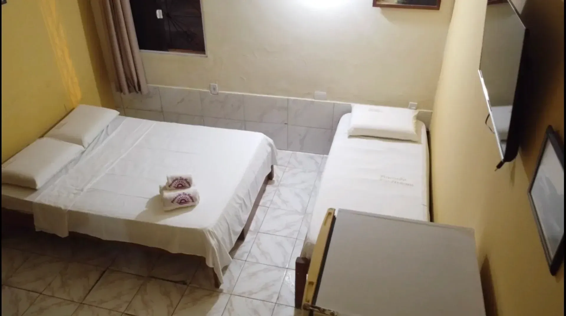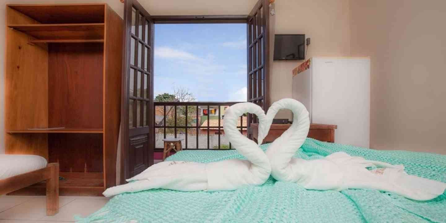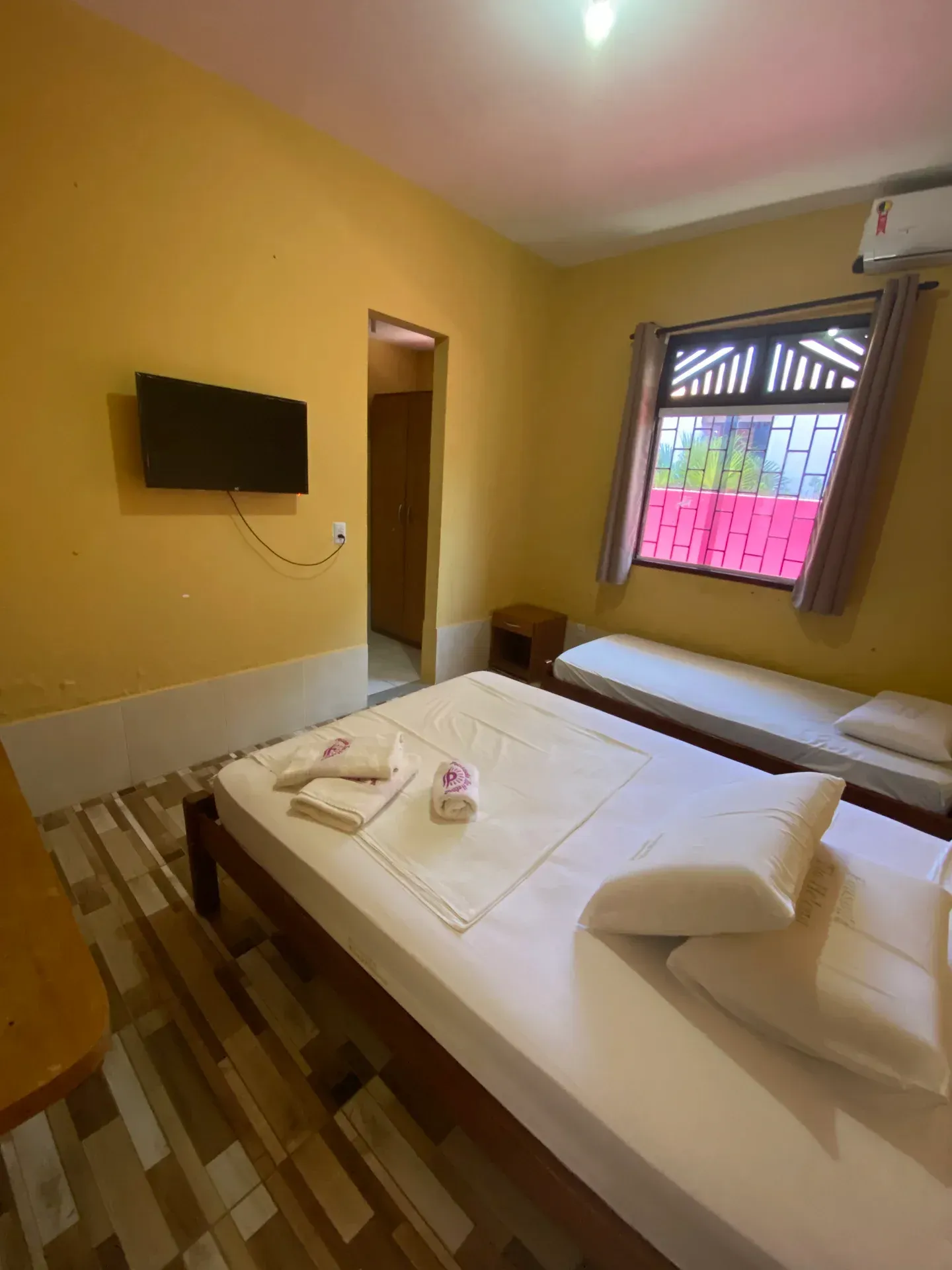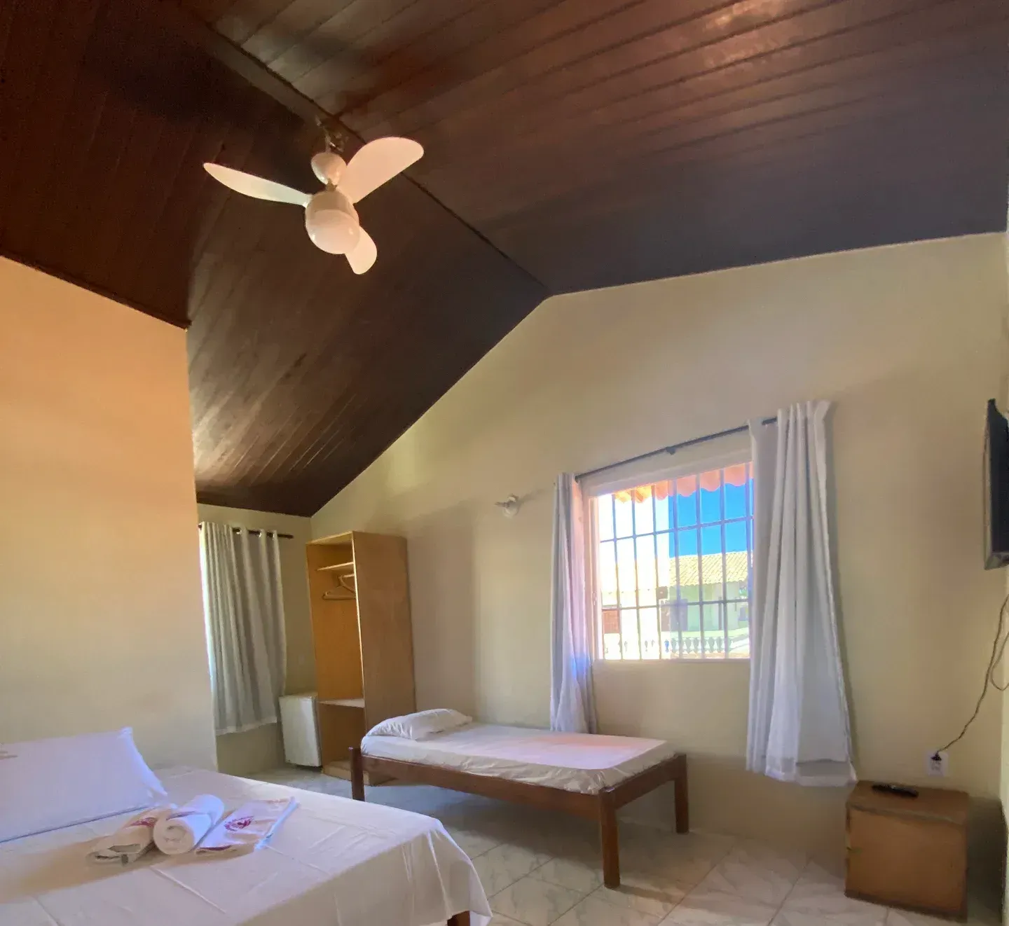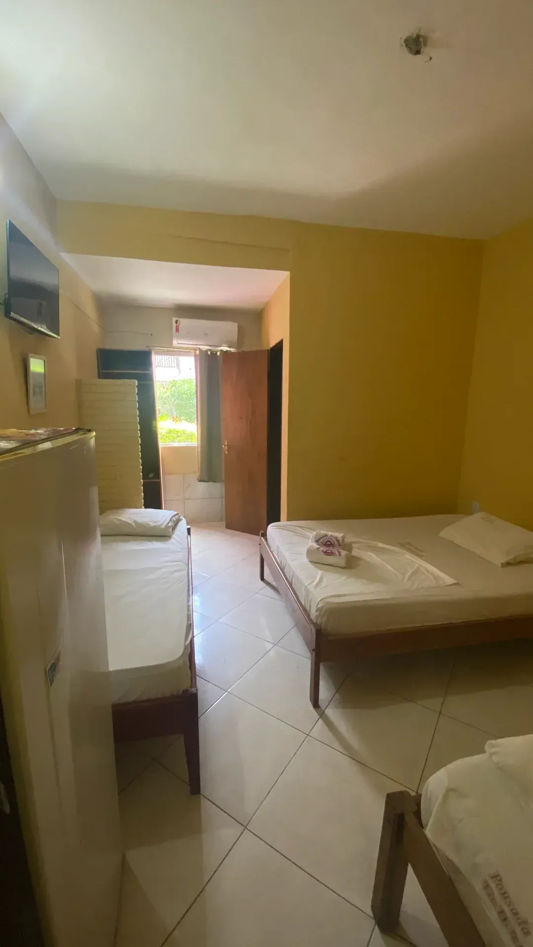 Temos quartos com Ar-condicionado, televisão, frigobar, varanda e sem varanda, quartos com ventilador, televisão, frigobar e temos quartos só com ventilador